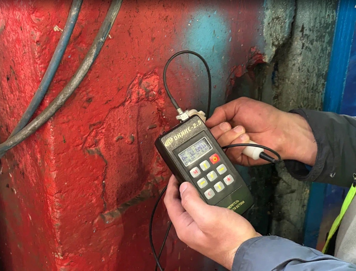 Фото 1. Определение прочности бетона методом ударного импульса с помощью склерометра «Оникс-2.5»