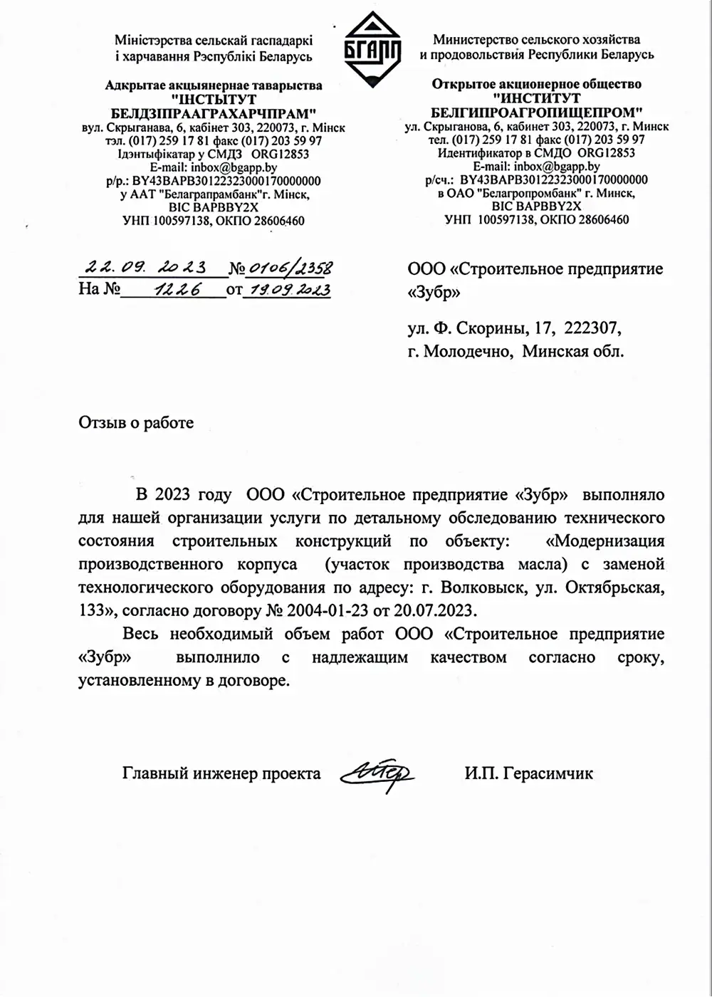 ОАО «Институт БелГипроАгропищепром»